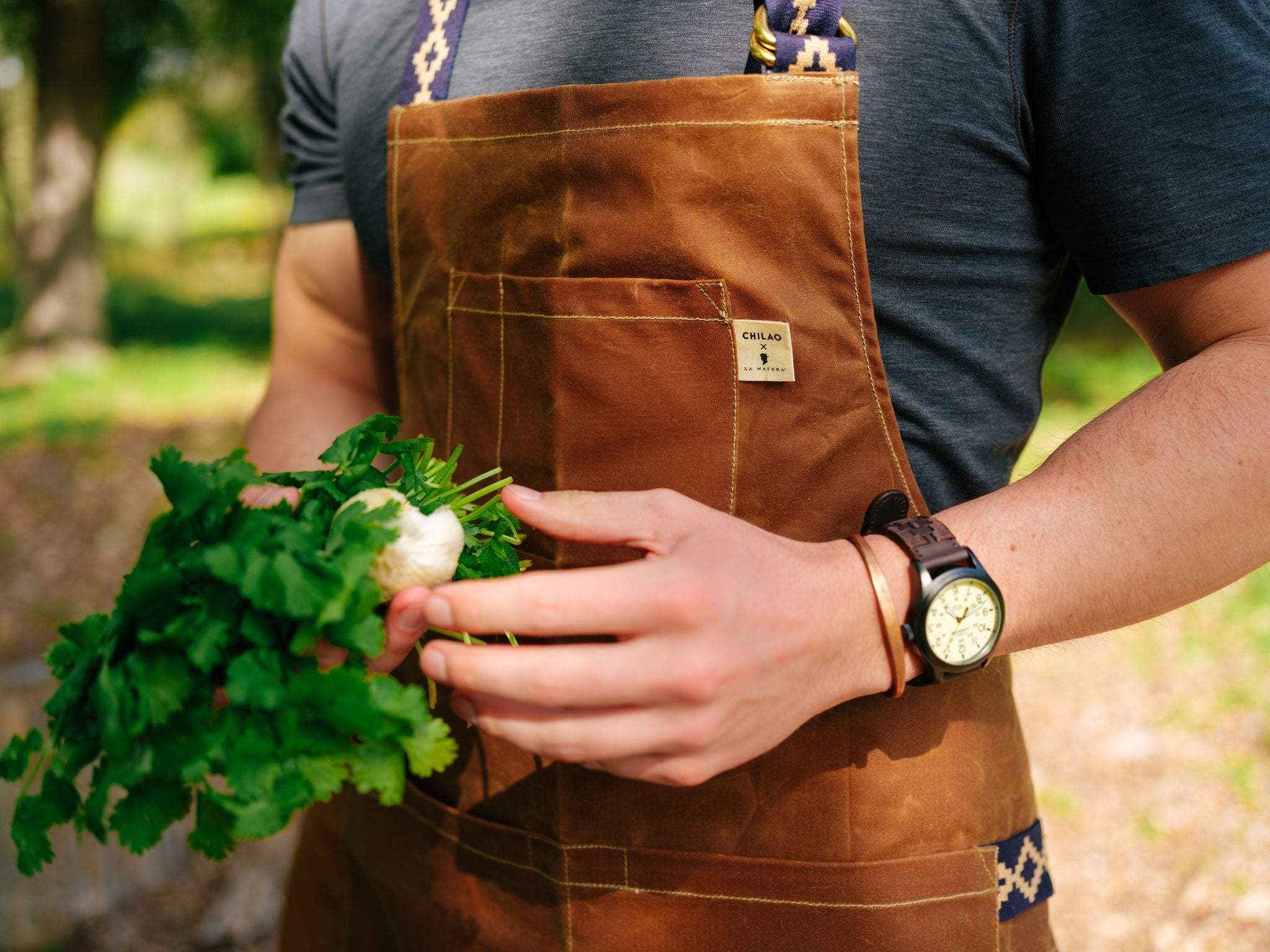 Made in partnership with our buddies and expert craftsmen over at Chilao, this unique textile adds a pop of color and texture to the apron, elevating its aesthetic appeal while also supporting traditional artisan communities. Embrace sustainability and authenticity with an apron that tells a story and becomes a part of yours.