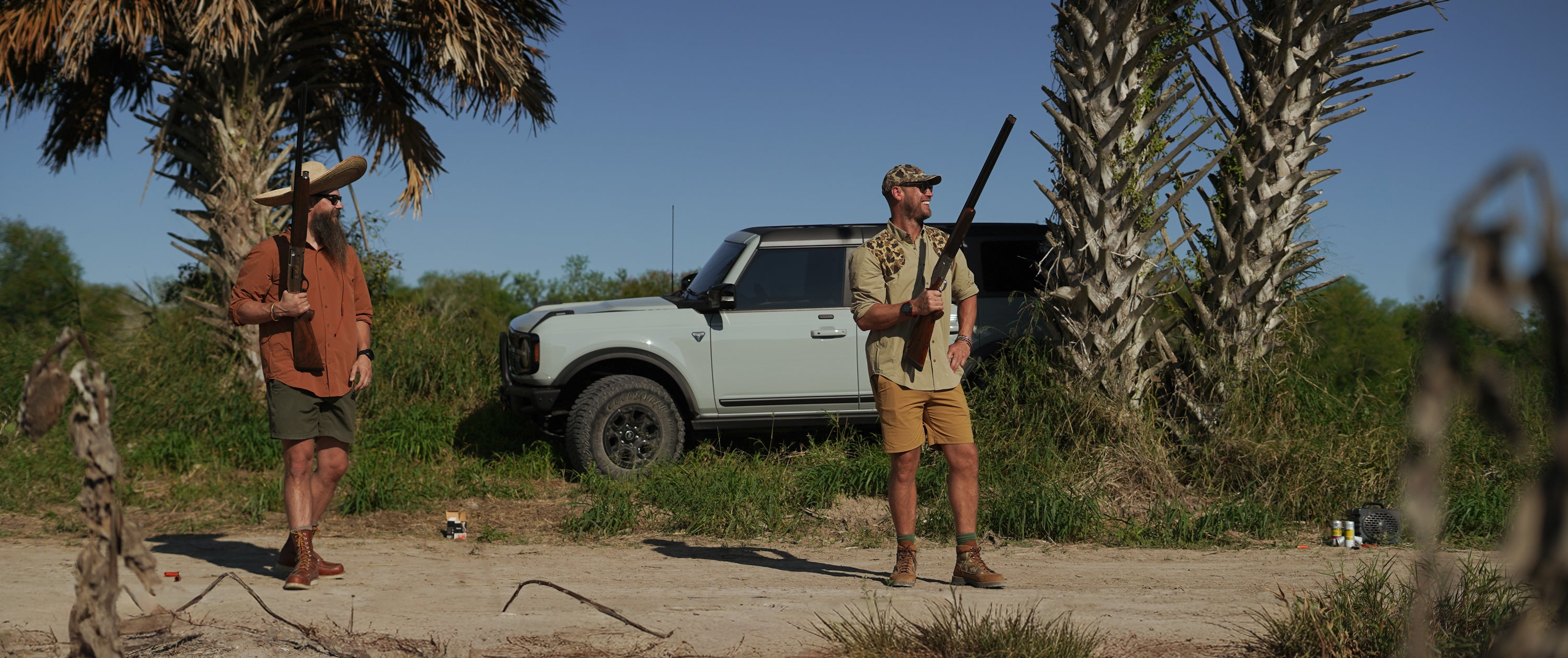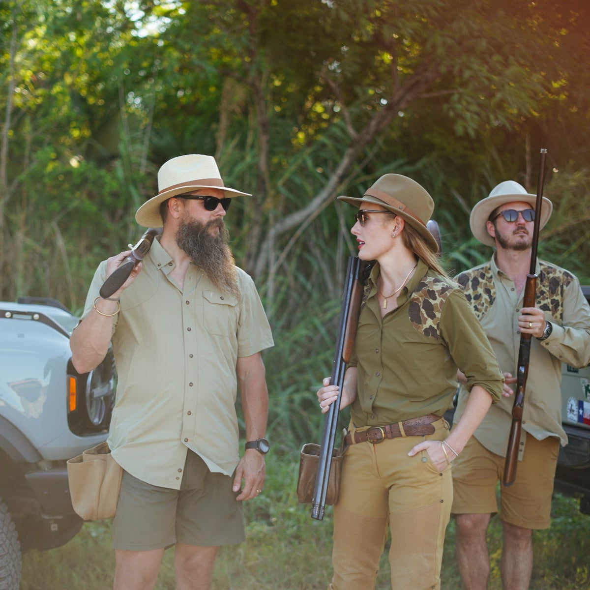 Field-tested gear for hot, fast shoots—breathable shirts, briar-proof pants, and modular strap vests built to move.