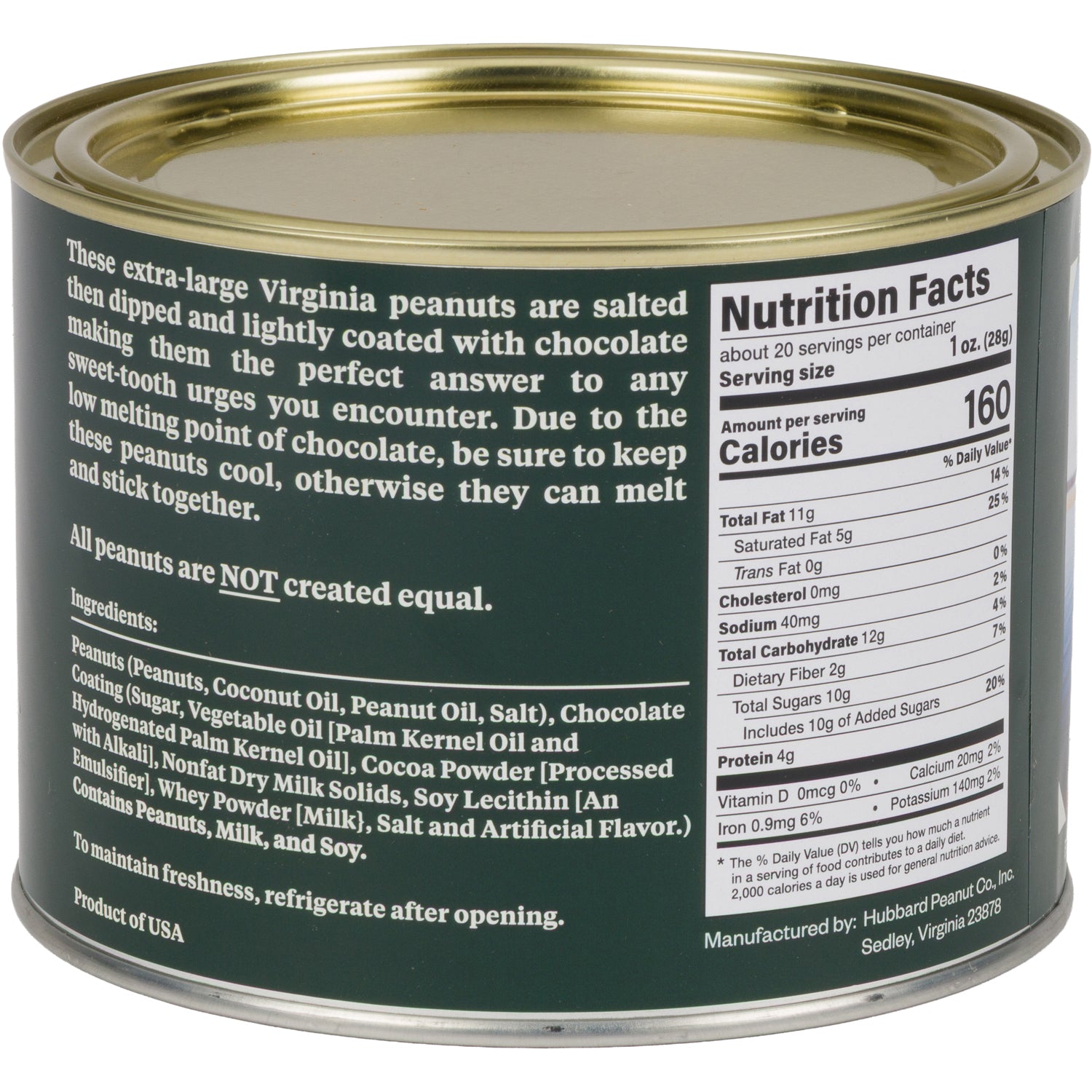 These extra-large Virginia peanuts are salted then dipped and lightly coated with chocolate making them the perfect answer to any sweet-tooth urges you encounter. Due to the low melting point of chocolate, be sure to keep these peanuts cool, otherwise they can melt and stick together.