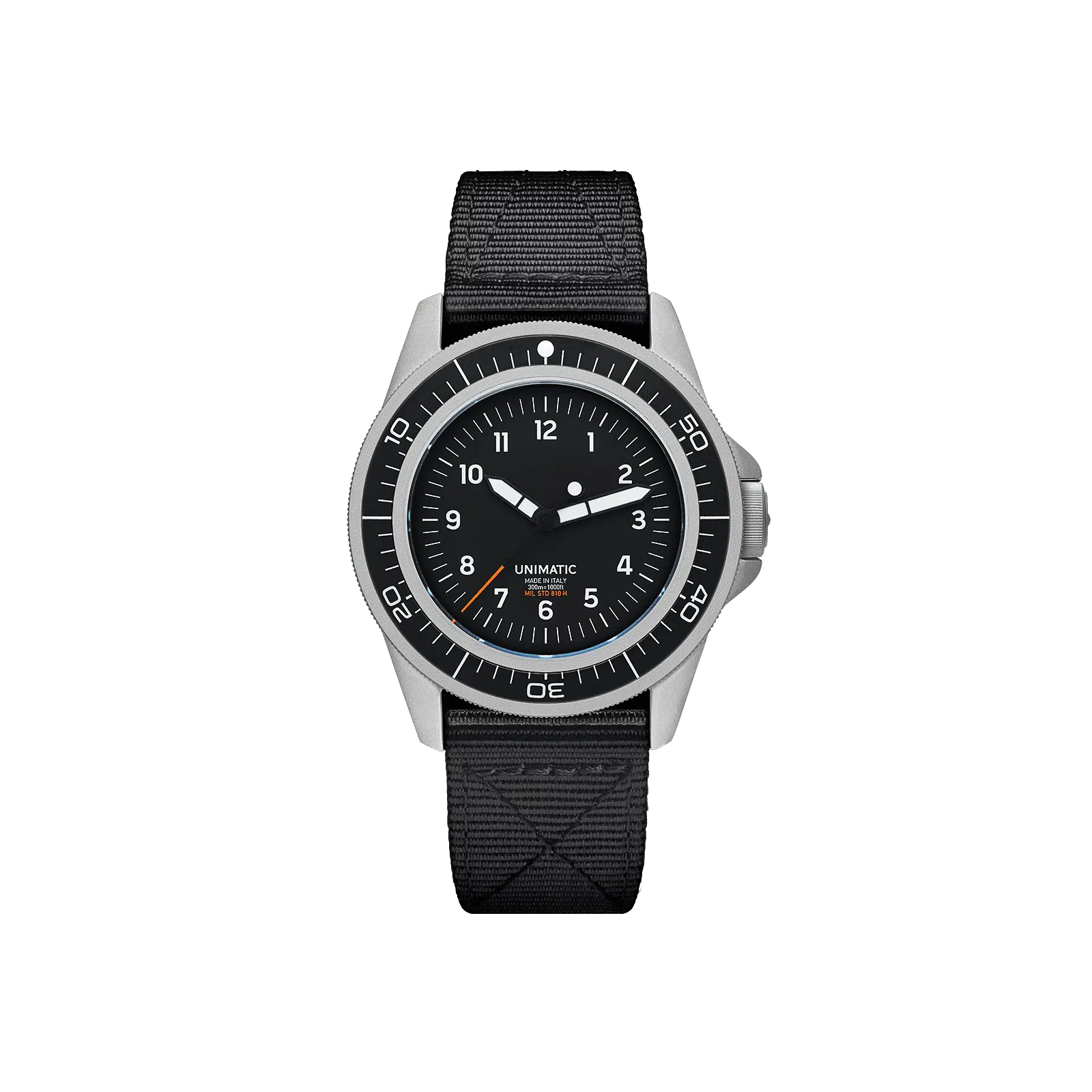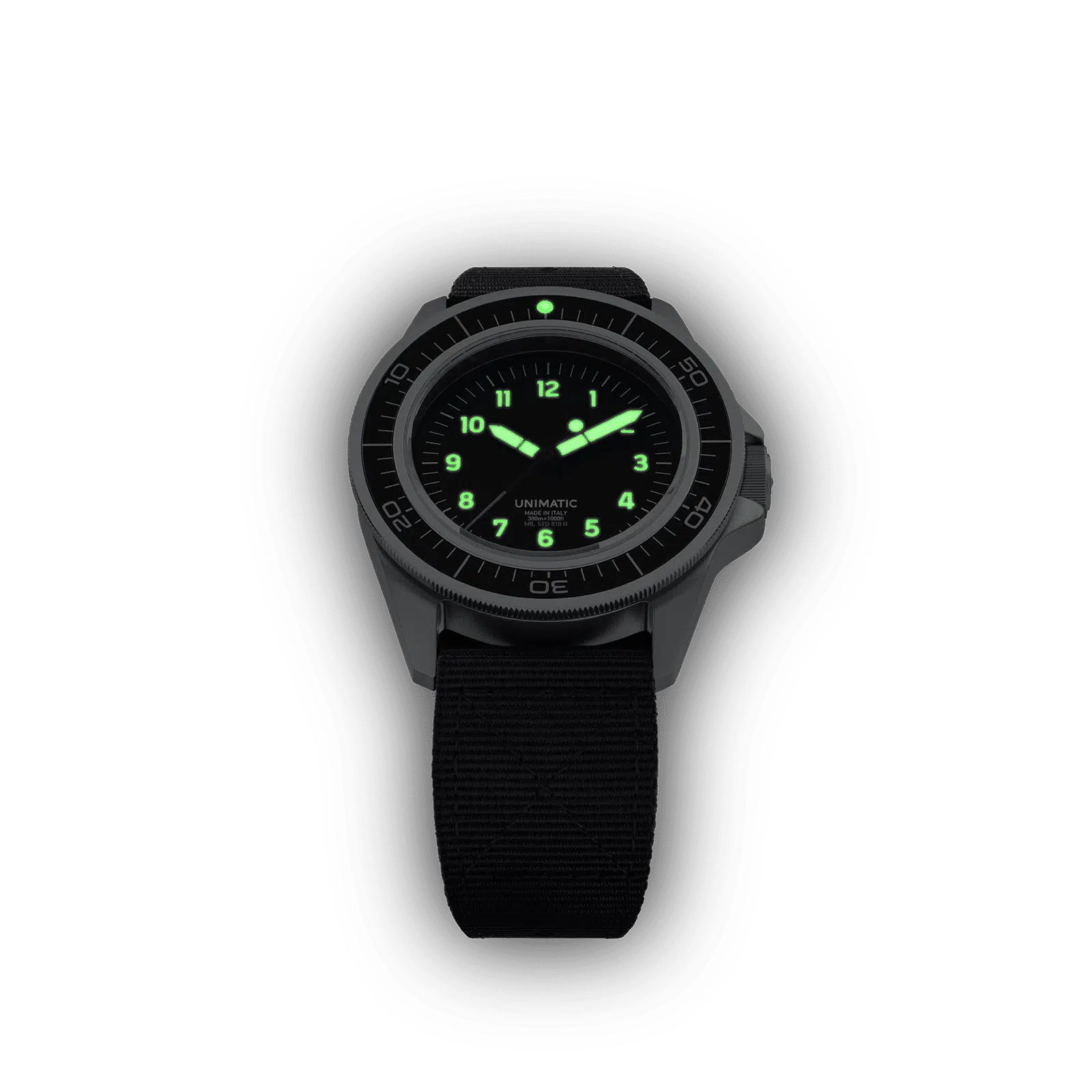 The Modello Uno Toolwatch UT1 is part of the second UNIMATIC permanent Toolwatch edition, designed for adventure and active lifestyles. This Made-in-Italy quartz dive watch features a reliable VH31 movement, the 360° protection system, and 300M water resistance, tested to MIL-STD-810H standards. Unique design elements include custom variable Arabic numerals and a countdown bezel.